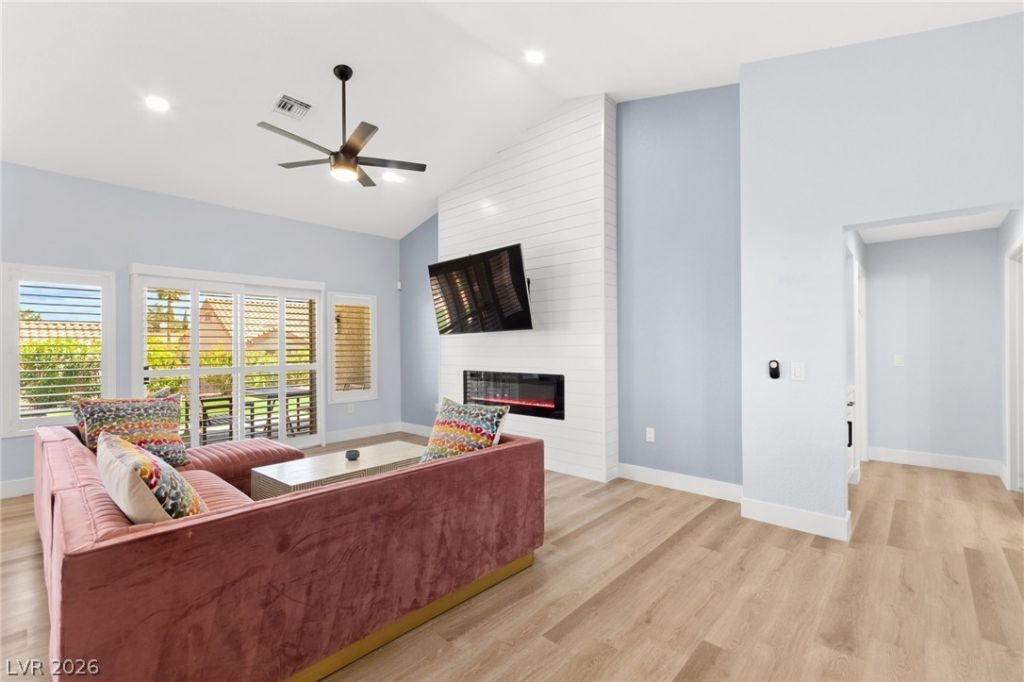 From the moment you arrive, this beautifully redesigned home showcases modern luxury with striking curb appeal, a private gated courtyard, and a low-maintenance front yard for easy living.Inside, the light-filled open-concept floor plan features soaring vaulted ceilings, custom LVP flooring, and elegant designer finishes throughout.Hunter shutters with a lifetime warranty and modern ceiling fans add a refined touch.The spacious living area includes a wood-paneled accent wall with a sleek electric fireplace.The reimagined kitchen offers Level 3 quartz countertops, shaker cabinetry with upgraded hardware, stainless steel appliances, and a large island.This home features 2 bedrooms and 2 bathrooms.The private primary suite includes a spa-like bathroom with a walk-in shower, dual vanities, and upscale finishes.Step outside to a backyard oasis with a covered patio and turf putting and chipping green, perfect for enjoying the Sun City Summerlin lifestyle and nearby resort-style amenities.